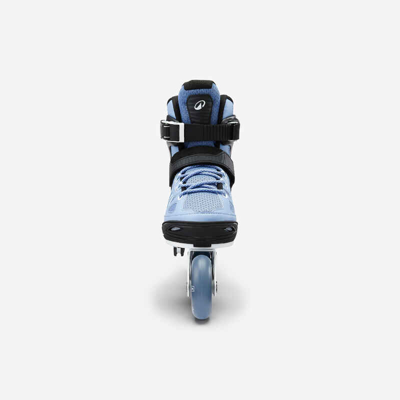 La platine du Roller Fit 5, c'est le coup de cœur d'Ewa, notre cheffe de produit. Les platines en aluminium apportent plus de rendement. Les grandes roues, de 76 mm et compatibles jusqu'à 80 mm en tailles 35 à 41, associées aux roulements ABEC 7 vous offrent plus de glisse et plus de vitesse. Pour freiner, nos rollers sont équipés d'un frein classique en tampon gomme que vous pouvez installer au pied droit ou gauche. Des tampons de rechange sont disponibles en magasin.