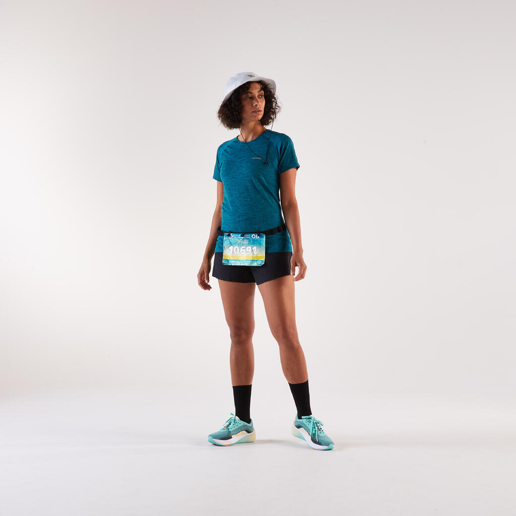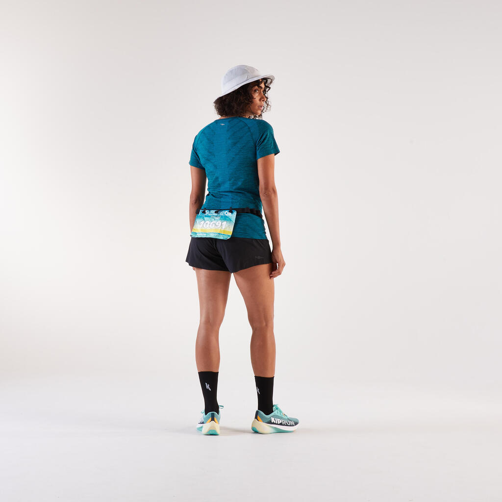 Fixez votre dossard sans épingles grâce au système d'accroche en 3 points. Légère et ajustable, cette ceinture permet aussi de transporter vos gels lors de vos compétitions de course à pied.