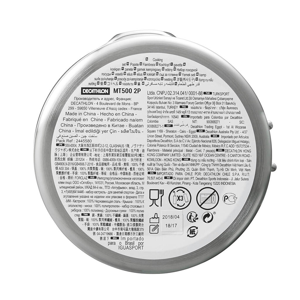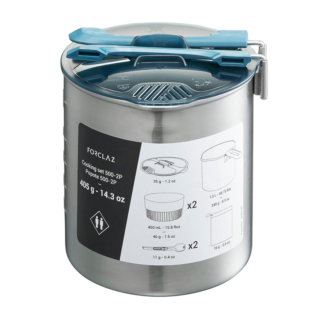 Cuisinez et mangez lors de vos trekkings avec cette popote en inox résistant et léger. Ce kit complet pour 2 personnes inclut 2 bols, 2 couverts pliants et un couvercle passoire compact.