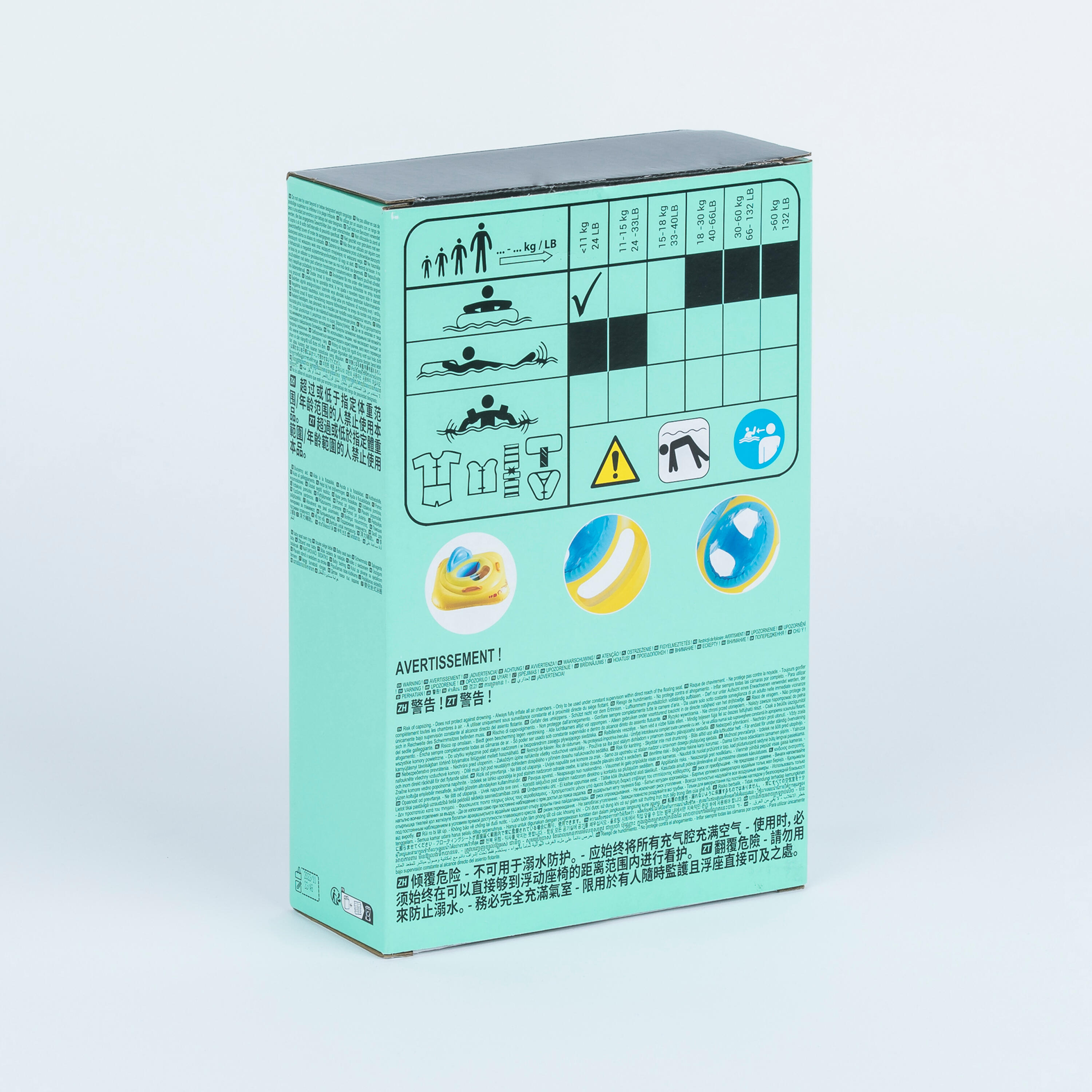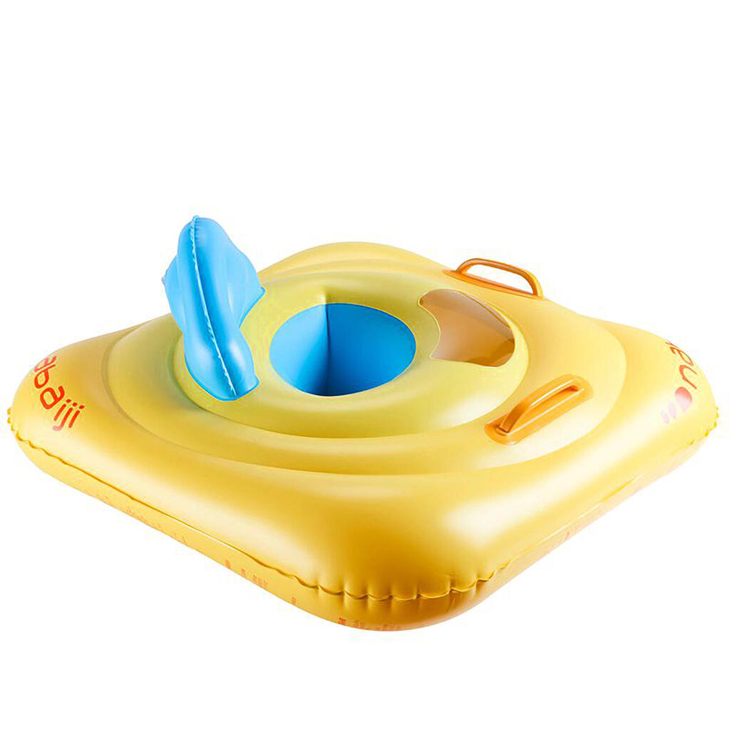 Cette bouée siège de piscine gonflable est conçue pour l'éveil aquatique des bébés de 7 à 11 kg. L'enfant observe sous l'eau grâce au hublot et vous le guidez à l'aide des deux poignées.