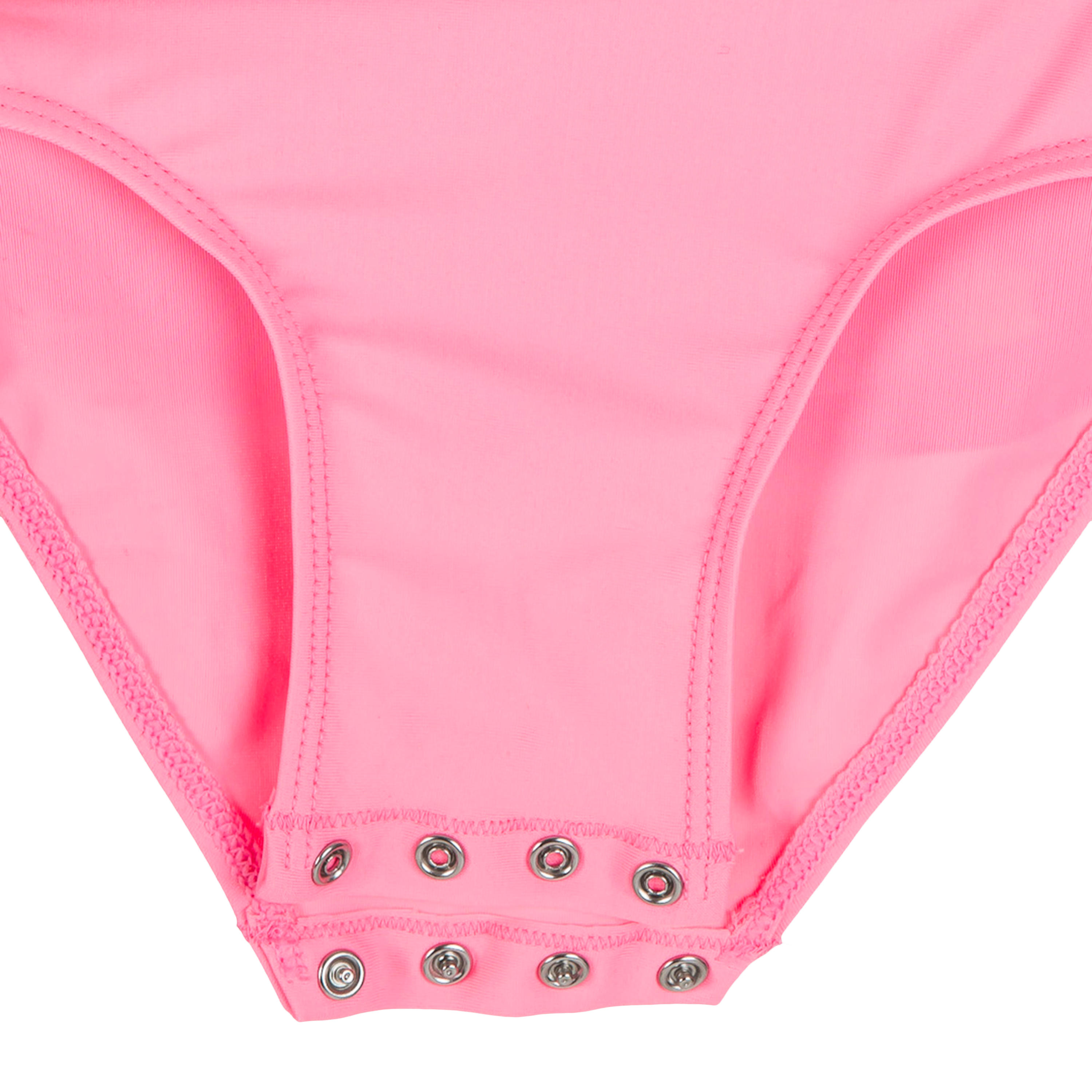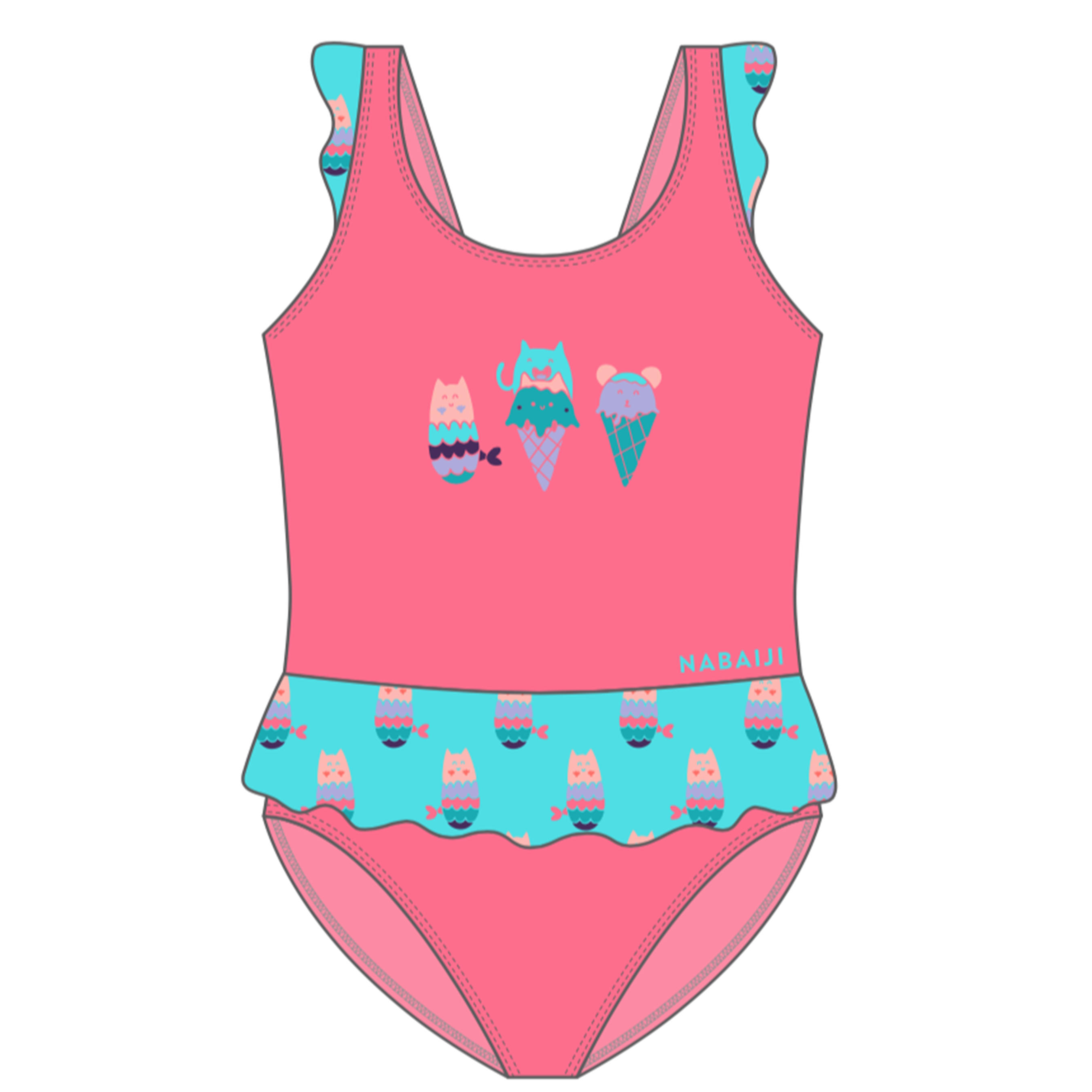Ce maillot de bain 1 pièce avec jupette et bretelles large habille les petites filles pour leurs premières baignades. Il s'enfile par le haut grâce aux pressions à l'entrejambe (jusqu'au 24 mois).