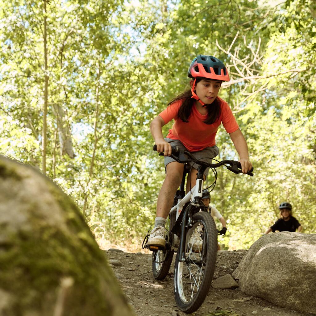 Ce VTT 20 pouces accompagne les enfants de 6 à 9 ans (120 à 135 cm) dans leur initiation au vélo tout terrain. Ses 6 vitesses permettent d'aborder les premiers dénivelés sur des sentiers vallonnés.